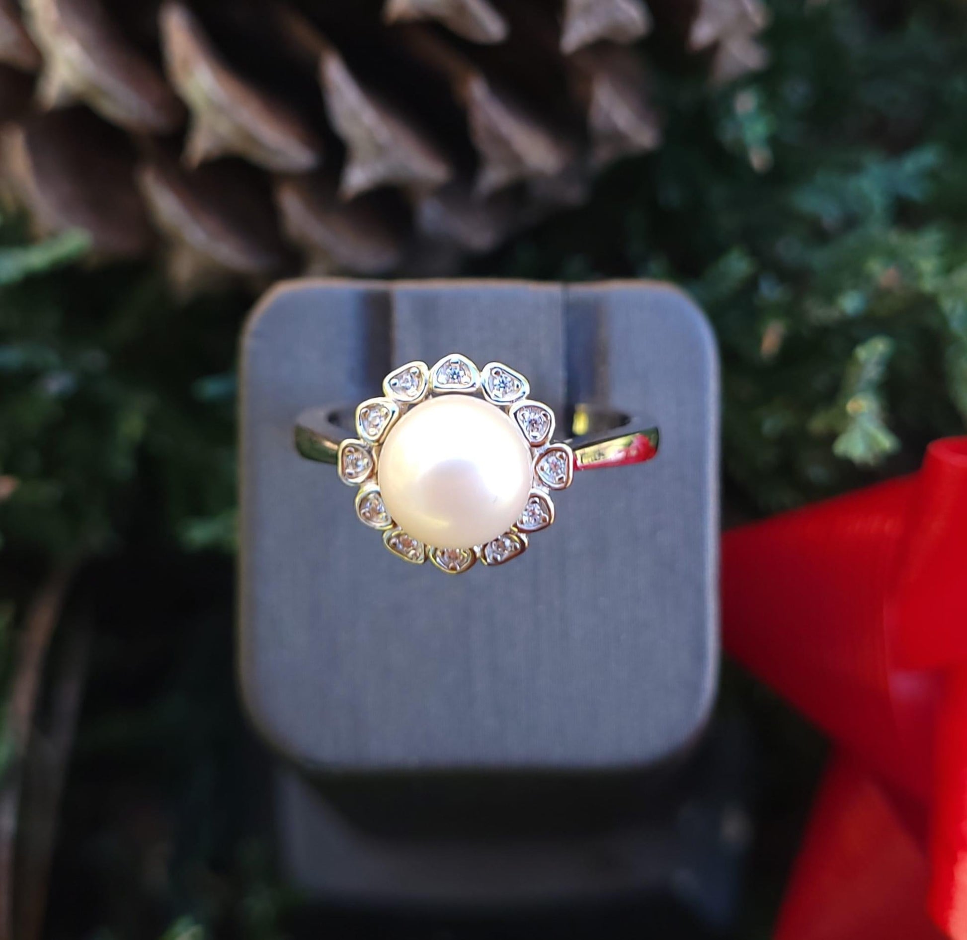 A freshwater cultured pearl is situated in a halo of round cut CZ stones. The ring is set in sterling silver
